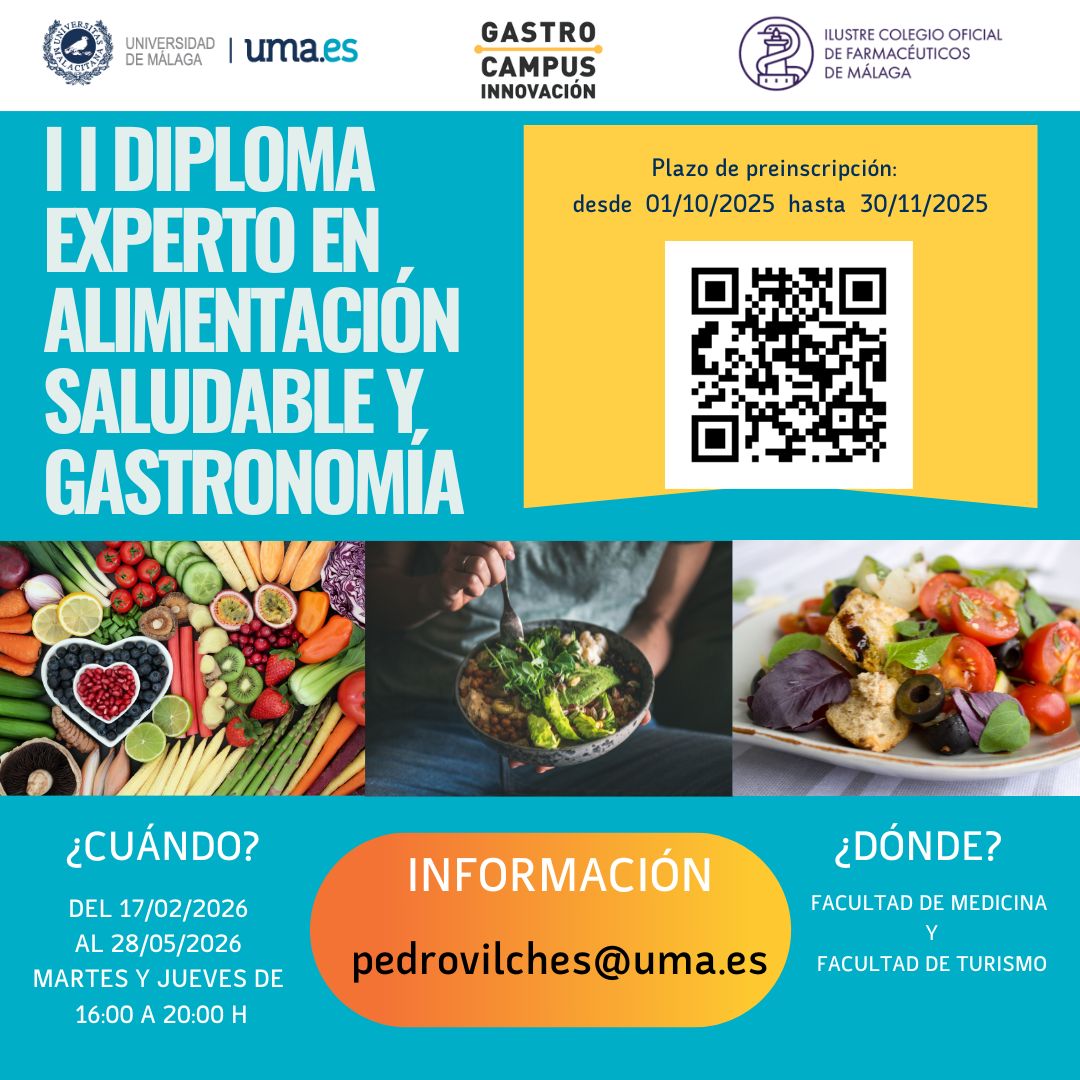 El Ilustre Colegio Oficial de Farmacéuticos de Málaga (ICOFMA) y la Universidad de Málaga (UMA) abren el plazo de preinscripción para la segunda edición del Diploma de Experto en Alimentación Saludable y Gastronomía, que se celebrará del 17 de febrero al 28 de mayo de 2026 en las Facultades de Medicina y de Turismo de la UMA.